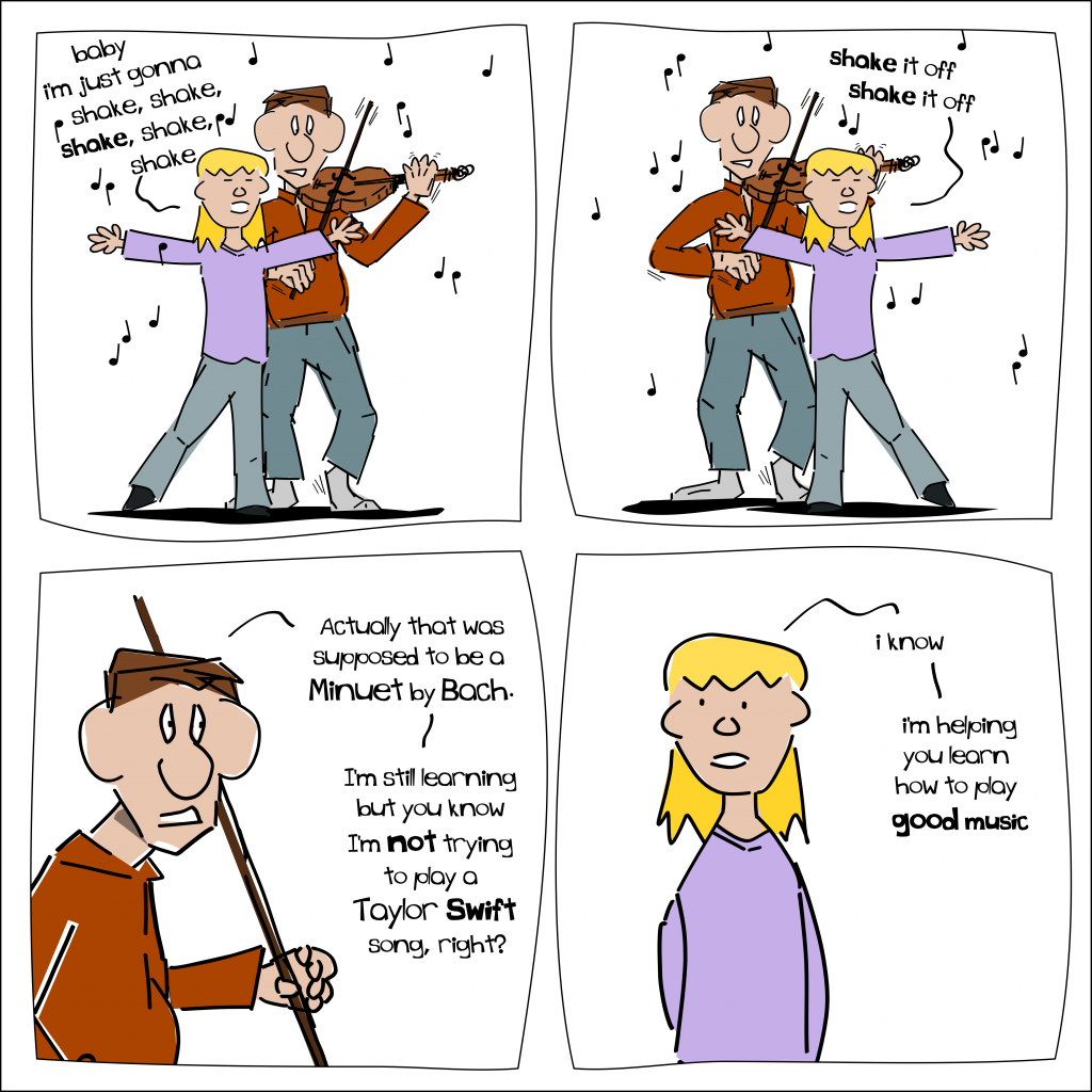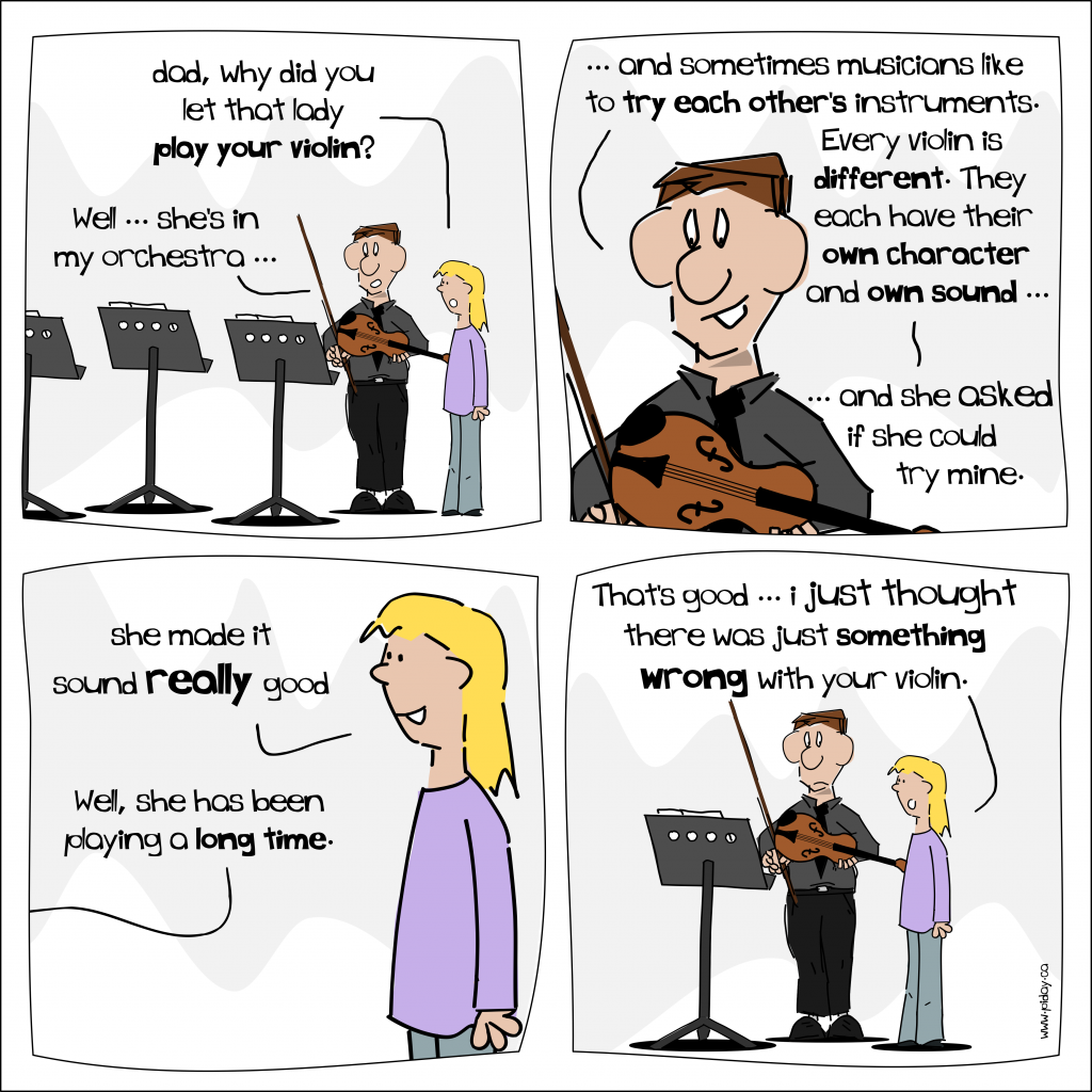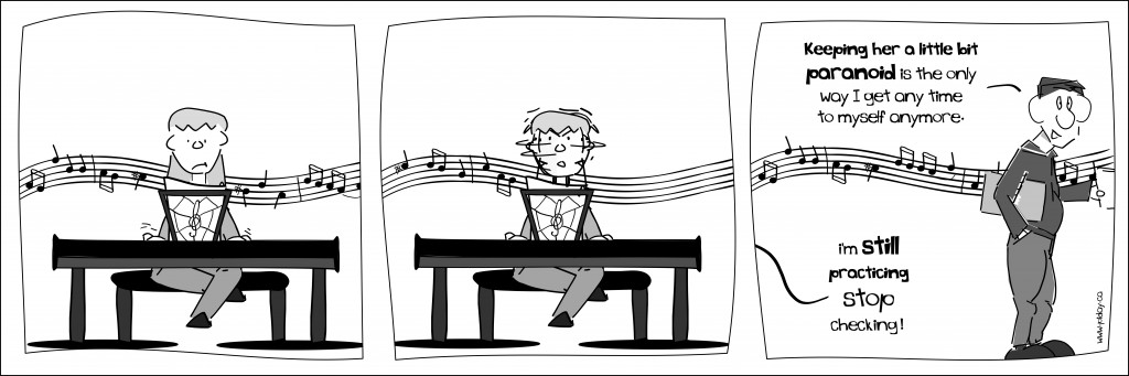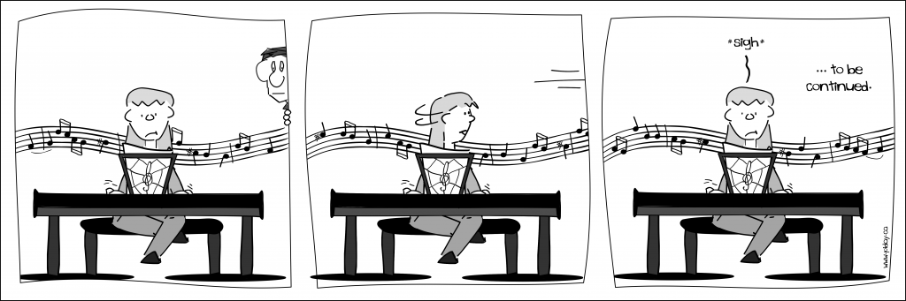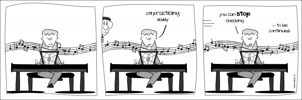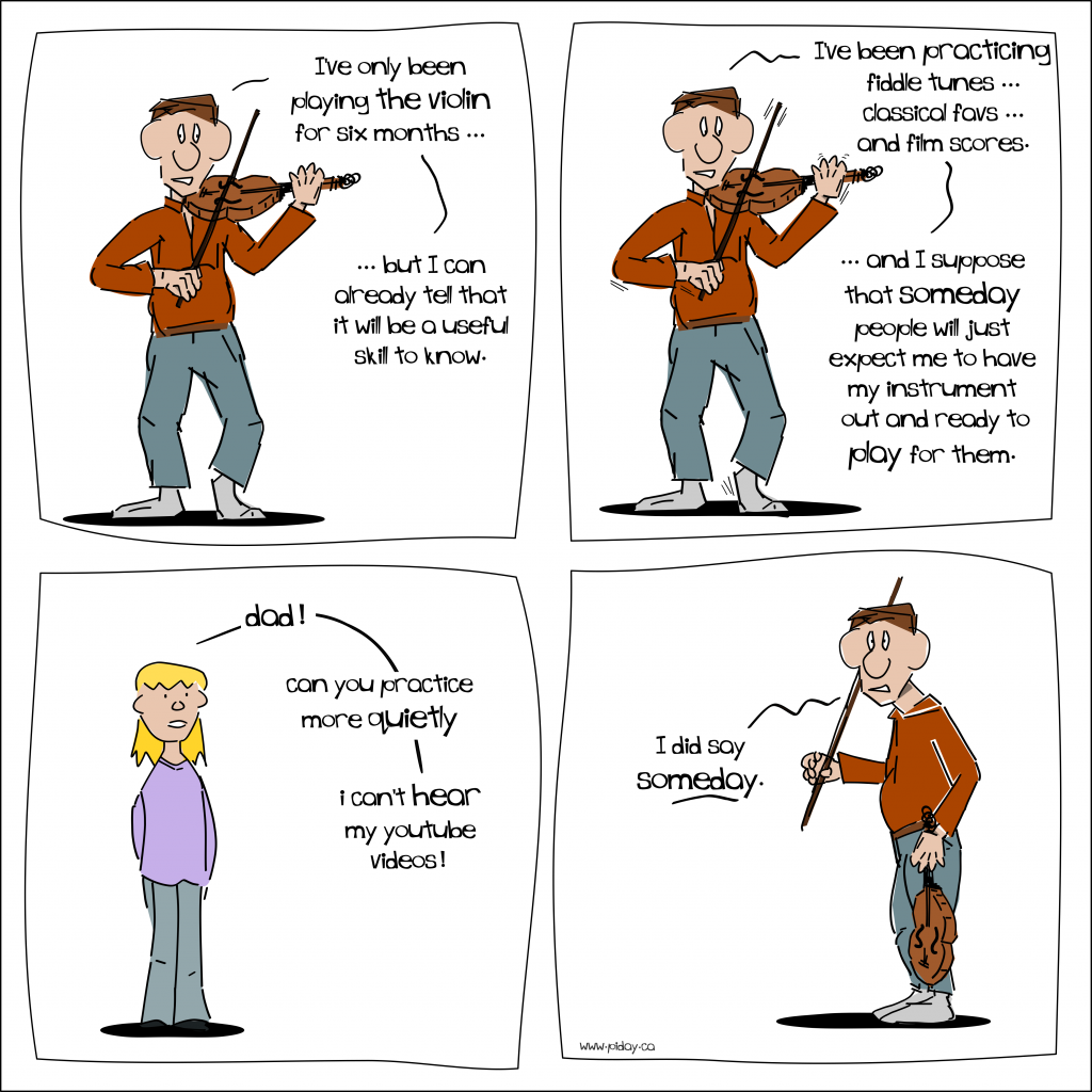 If anything, since stopping my artistic work on this comic I have gotten more and more into music. But even back then the Kid was learning the piano and I was learning the violin, so there was a lot of musical learning going on at our house. It made for endless comedic stories.